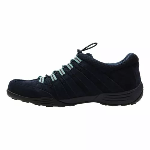 Hemistich Rose, a walking shoe-inspired women’s style in a navy blue suede and textile mix. The sturdy, sporty upper is teamed with a chunky, durable sole while elastic hiker laces finish the look. Textile linings feel comfortable and breathable. Heel height: 3cm.
