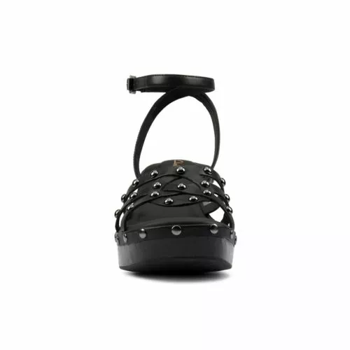 Back for another season, our best-selling wedge profile returns with a new square toe in Maritsa 70 Sun. Metal stud detail adds a contemporary twist to premium black leather straps, while a high cork wedge and cushioned footbed.
