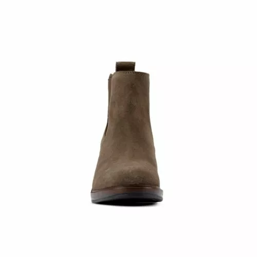 A modern Chelsea boot silhouette creates this smart casual women’s boot, combining dark olive suede and elastic panels with a heel loop, while the 7.5cm lightweight wedge heel adds wearable height. Leather linings feel luxurious against the foot.
